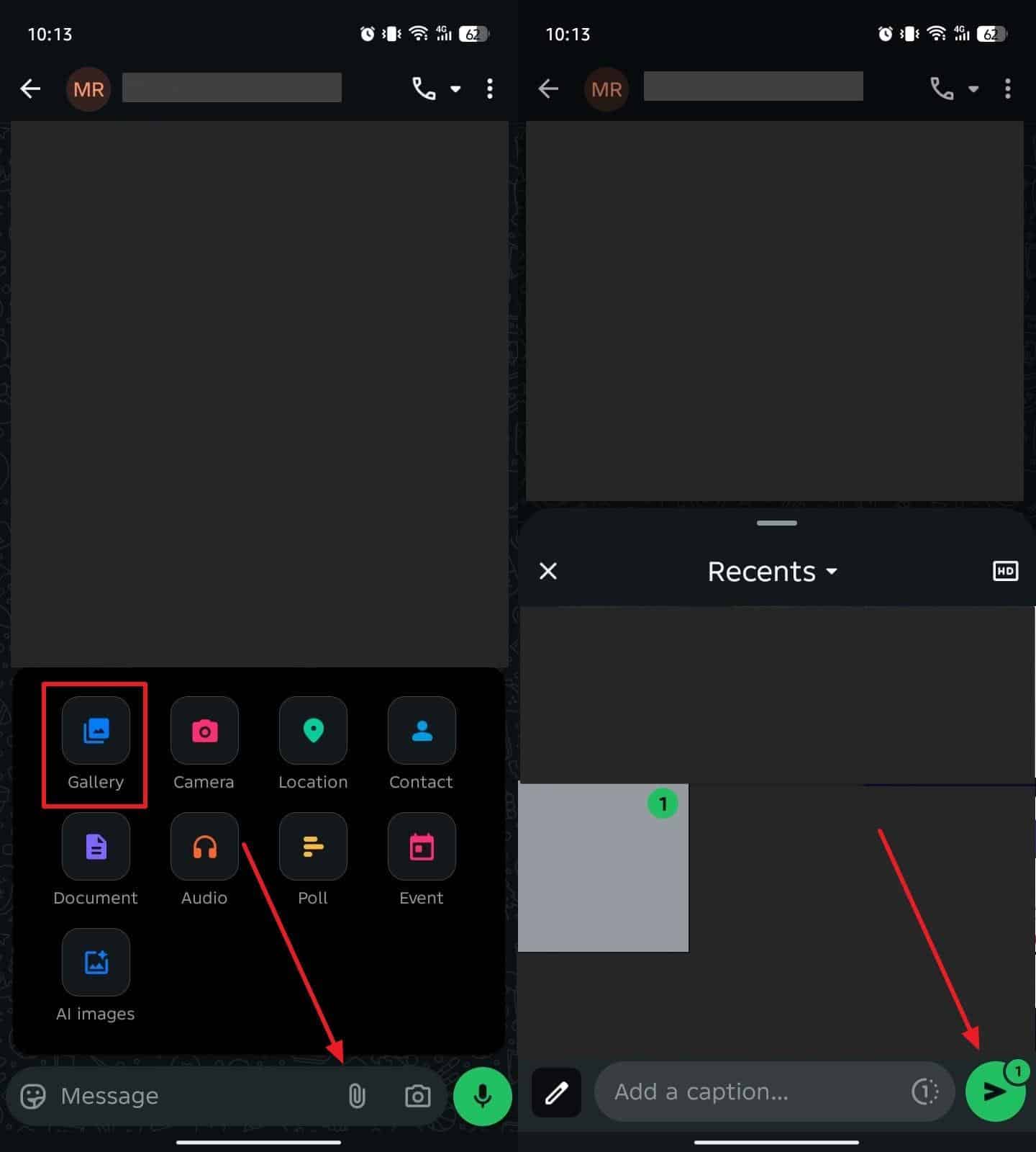 Step 1. Upon opening the chat screen, tap the “Attachment” icon to open a menu. Then, choose “Gallery” or any other data type to select your preferred data and press the “Send” button.