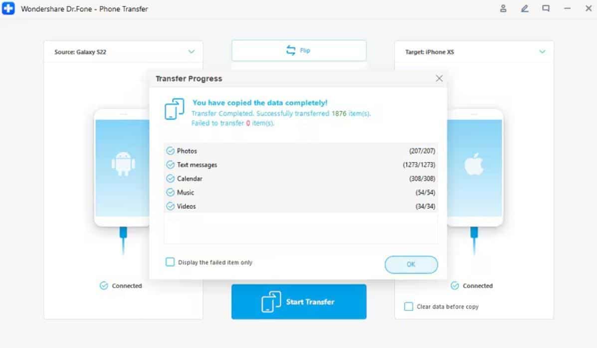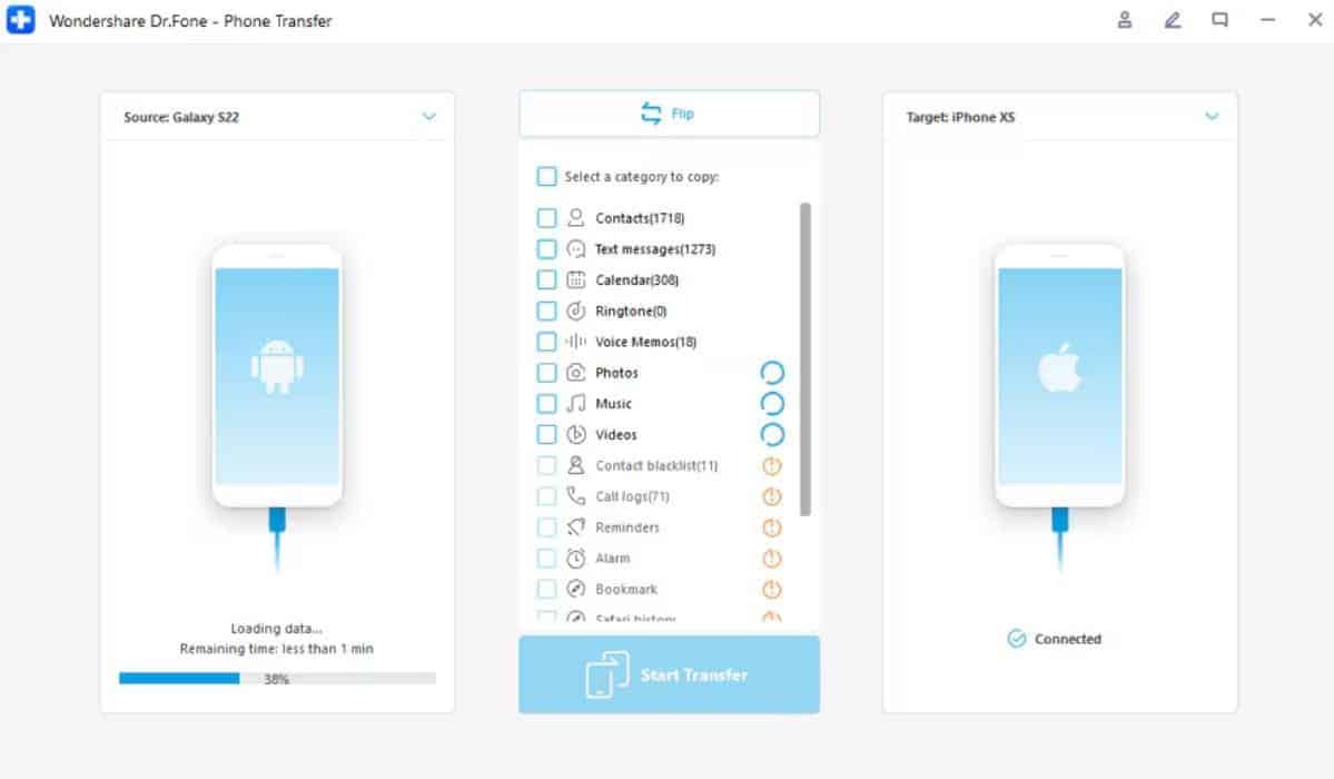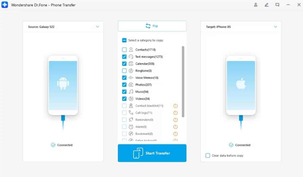 Make sure the “Android” device is set as the “Source” and the “iPhone” as the “Destination.” Go ahead and opt for the desired data types you want to move before pressing “Start Transfer.”