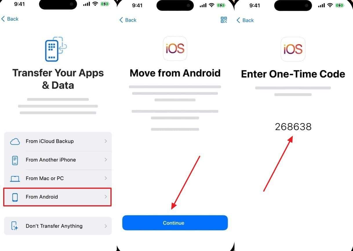 Step 1. During the iPhone setup, select “From Android” and tap “Continue” to receive the “One-Time Code.”