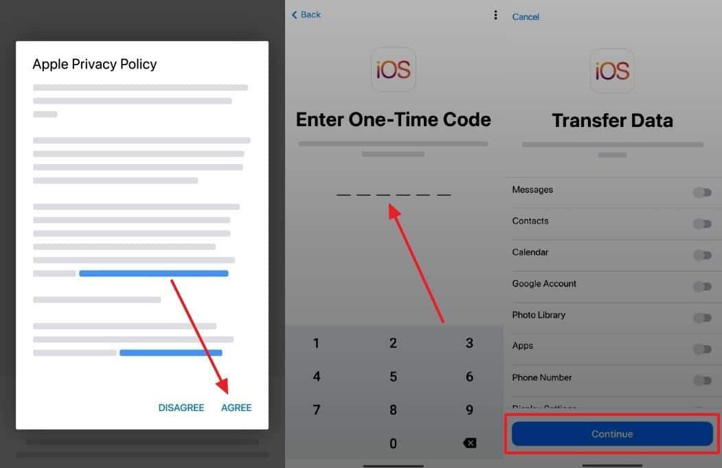 Step 2. On your Android phone, tap “Agree” to enter the received “One-Time Code” and select the data types you want to press “Continue.”